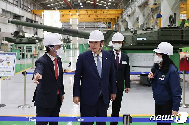 (서울=뉴스1) 오대일 기자 = 윤석열 대통령이 24일 오후 경남 창원시 현대로템을 방문해 전시 장비에 대한 설명을 듣고 있다. (대통령실 제공) 2022.11.24/뉴스1