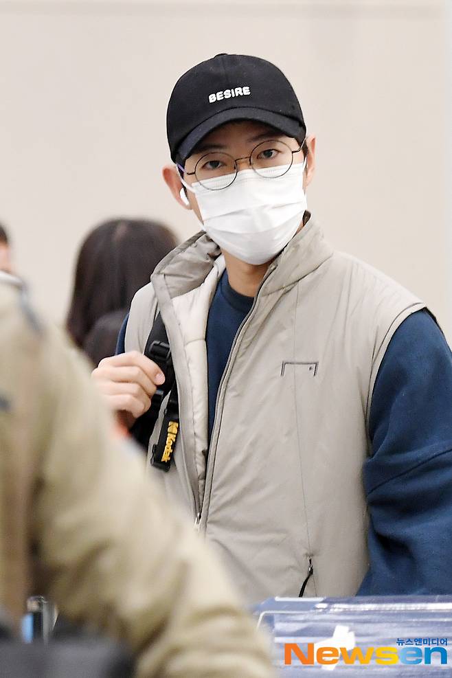 배우 송중기가 11월 24일 오후 인천 중구 운서동 인천국제공항 제 2여객터미널을 통해 지난 21일(현지시간) 미국 뉴욕의 힐튼 미드타운에서 열린 ‘제50회 인터내셔널 에미상 시상식’ 일정을 마치고 미국 뉴욕에서 입국하고 있다.