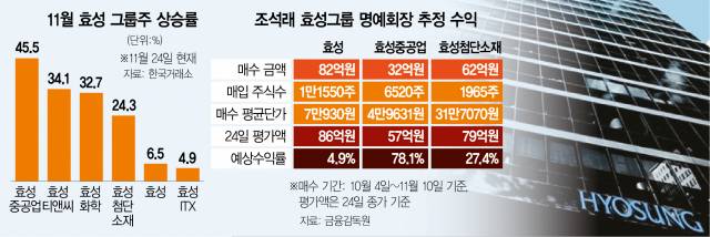 조 명예회장이 최근 한 달 동안 가장 큰 수익을 본 종목은 효성중공업으로 추정된다. 조 명예회장은 효성중공업을 10월부터 이달 1일까지 총 6520주를 매수했으며 평균 매수 단가(4만 9631원)와 24일 종가(8만 6700원)을 고려해 계산했을 때 78.12%의 수익을 봤을 것으로 예상된다. 같은 방식으로 효성첨단소재와 효성을 계산했을 때 조 명예회장의 예상 수익률은 각각 27.41%, 4.87%로 관측된다. 한 금융투자 업계 관계자는 “통상 오너가(家)의 자사주 매입을 저점 통과 시그널로 해석하는 시선도 있다”며 “향후 그룹 경영에서 지배력과 영향력을 강화할 수 있는 것도 장점”이라고 덧붙였다.