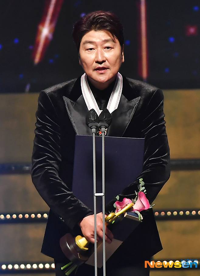 이날 '2022 대한민국 대중문화예술상' 시상식에 참석한 송강호가 수상소감을 전하고 있다.