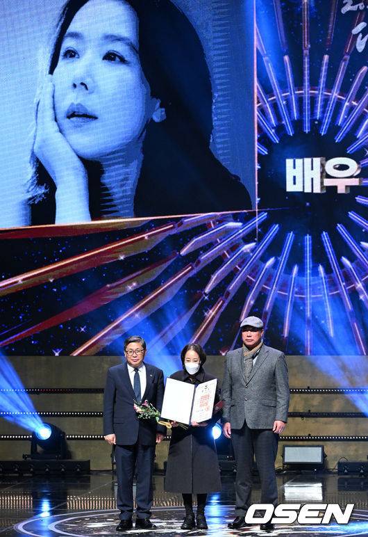고 강수연의 은관 문화훈장을 대리 수상한 동생 강수경 씨가 기념촬영을 하고 있다. 2022.11.24 /sunday@osen.co.kr