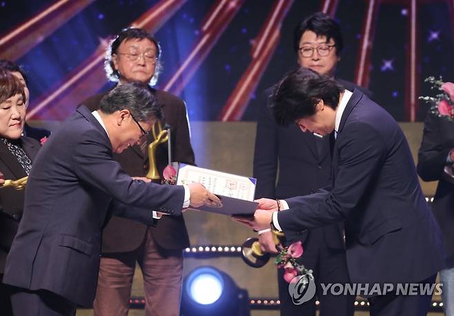 (서울=연합뉴스) 이재희 기자 = 음악감독 고 방준석의 동생 방준원 씨가 24일 오후 서울 중구 국립극장에서 열린 '2022 대한민국 대중문화 예술상' 시상식에서 전병극 문화체육관광부 제1차관에게 대통령표창을 받고 있다. 2022.11.24