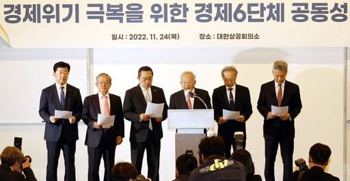 손경식 경총 회장을 비롯한 경제6단체장이 24일 서울 중구 대한상공회의소에서 ‘경제위기 극복을 위한 긴급 기자회견’을 열고 공동입장을 발표하고 있다. 왼쪽부터 우태희 대한상의 상근부회장, 권태신 전경련 상근부회장, 구자열 무협 회장, 손경식 경총회장, 최진식 중견련 회장, 이재원 중기중앙회 전무.