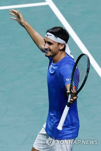 epa10324577 Italian tennis player Lorenzo Sonego celebrates after winning his match against US player Frances Tiafoe during the Davis Cup quarter-final between Italy and USA in Malaga, southern Spain, 24 November 2022. EPA/Julio Munoz