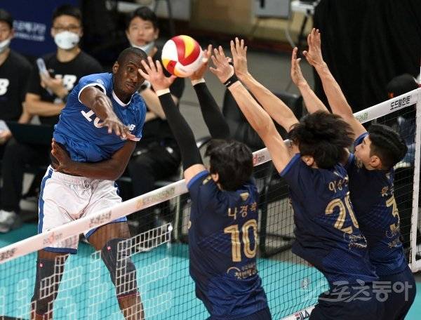 24일 서울 장충체육관에서 열린 ‘2022~2023 도드람 V-리그’ 남자부 우리카드와 현대캐피탈 경기에서 현대캐피탈 오레올이 우리카드의 블로킹 사이로 스파이크 공격을 하고 있다.