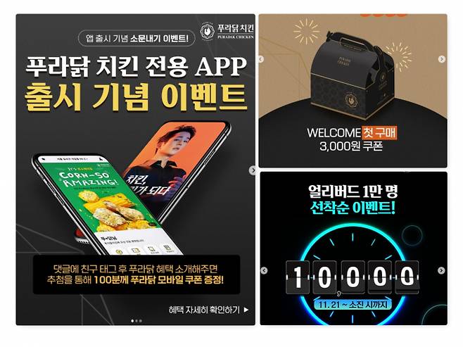 한편, 푸라닭 치킨은 앱 출시를 기념해 오는 27일까지 공식 인스타그램에서 소문 내기 이벤트를 진행한다. 이벤트 게시물 내 댓글로 친구를 태그 해 푸라닭 전용 앱에서만 만날 수 있는 특별한 이벤트를 소문내면 된다. 추첨을 통해 선정된 100명에게는 푸라닭 치킨 모바일 쿠폰이 제공된다.