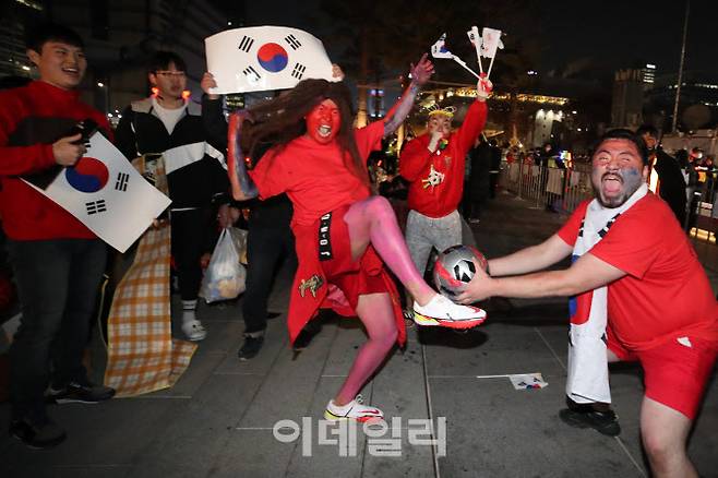 [이데일리 이영훈 기자] 2022 카타르 월드컵 한국과 우루과이의 경기가 열리는 24일 오후 서울 종로구 광화문 광장에서 시민들이 응원을 펼치고 있다.