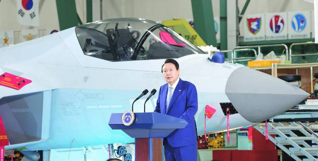 윤석열 대통령이 24일 경남 사천 한국항공우주산업(KAI) 항공기 조립 공장에서 방산수출전략회의를 주재하고 있다. 회의에서 국방부는 2027년까지 시장점유율 5% 돌파로 세계 4대 방산 수출국으로 도약하겠다는 목표를 제시했다. 윤 대통령 뒤편에 국산 초음속 전투기 KF-21 시제기가 놓여 있다.