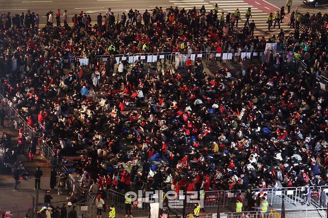 [이데일리 이영훈 기자] 2022 카타르 월드컵 한국과 우루과이의 경기가 열리는 24일 오후 서울 종로구 광화문 광장에서 시민들이 응원을 펼치고 있다.