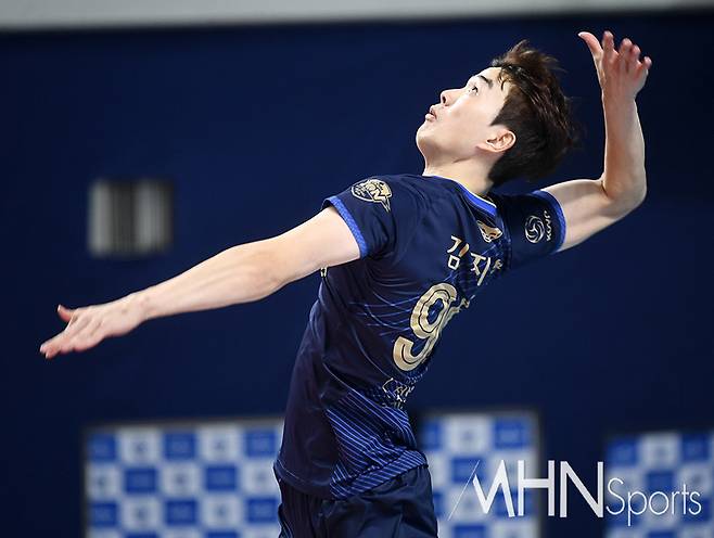 우리카드 김지한이 서브를 시도하고 있다.