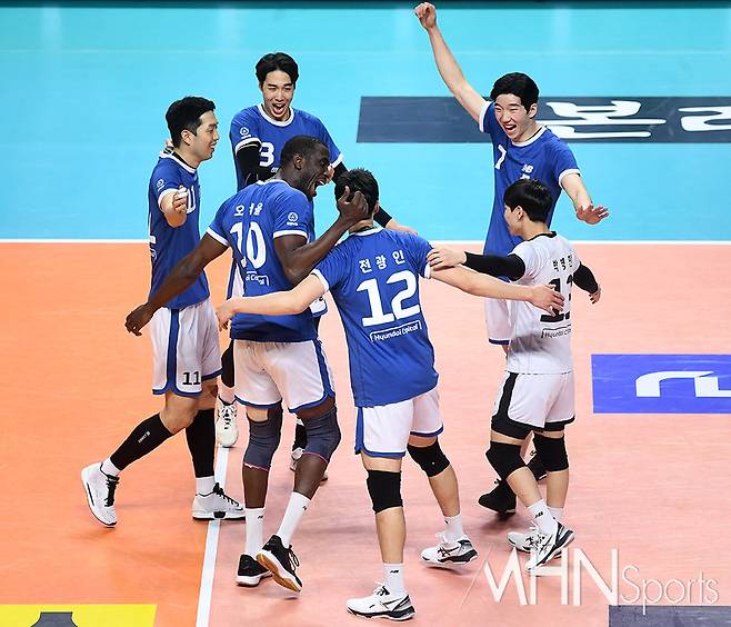 현대캐피탈 선수들이 득점에 기뻐하고 있다.