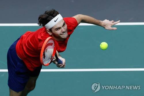epa10324924 US tennis player Taylor Fritz in action against Italian Lorenzo Musetti during the Davis Cup quarter-final between Italy and USA in Malaga, southern Spain, 24 November 2022. EPA/Julio Munoz