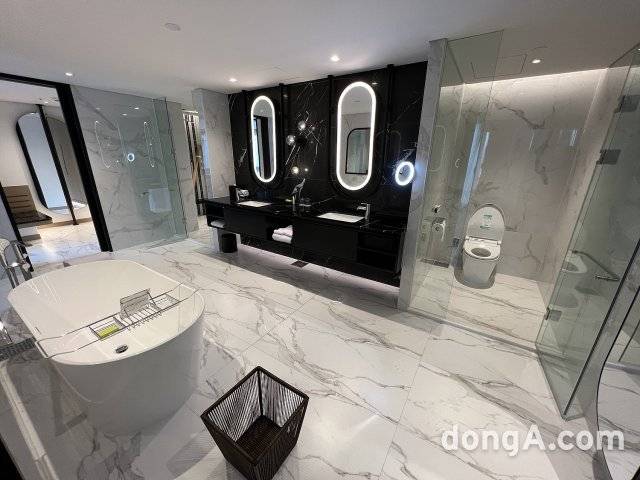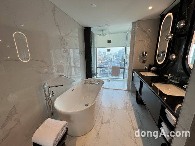 최상위 객실인 르메르디앙스위트룸은 넓은 공간과 시티뷰 전망을 갖췄다. 소파에 앉아 TV를 시청하거나 업무를 볼 수 있는 공간이 함께 있고 침실공간이 별도로 마련됐다. 넉넉한 수납공간도 갖췄다. 욕실은 넓고 화려한 인테리어가 특징이다. 거실공간과 마찬가지로 욕실에서도 도시 전망을 즐길 수 있다. 전반적으로 모든 객실의 욕실 인테리어에 많은 공을 들였다. 호텔 관계자는 최근 욕실을 다양하게 활용하는 고객 니즈를 반영한 것이라고 설명했다.