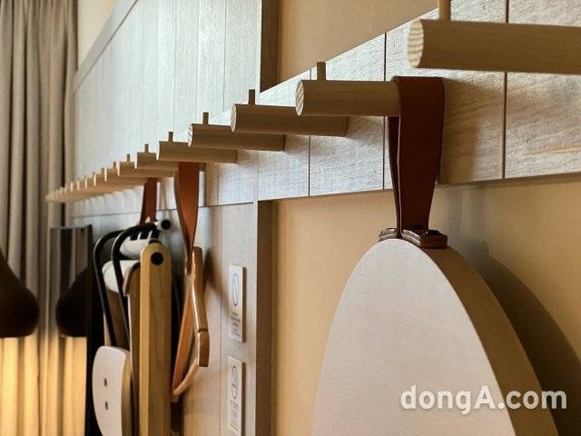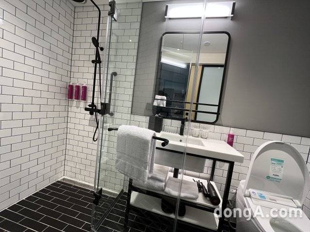 로비에서 느낀 감각은 객실로도 이어진다. 엘리베이터에서 내리면 화려한 핑크빛 네온사인이 시선을 끈다. 어두운 복도 공간은 클럽 분위기를 연상시킨다. 객실은 공간감을 극대화하면서 고객이 필요에 따라 객실 용품을 활용할 수 있도록 했다. 모든 객실에 간이 의자와 각종 도구가 걸린 옷걸이벽이 있다. 가방이나 외투, 모자 등을 걸어둘 수 있다. 타일로 꾸며진 욕실은 스타일리시하다. 샤워기와 드라이기, 거울 테두리, 손잡이 등을 블랙 컬러로 만들어 독특한 욕실 분위기를 구현한다. 목시 서울 명동 측은 일하고 놀기에 완벽한 객실을 구현했다고 강조했다.