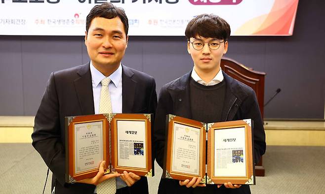 ‘돌아오지 못한 북 억류자 6명’ 기사로 제386회(2022년 10월) 한국기자협회 이달의 기자상(기획보도 신문·통신부문)을 수상한 본지 정치부 김병관(오른쪽)·조병욱 기자가 24일 시상식에서 포즈를 취하고 있다. 김 기자는 소감에서 “억류자 가족에게 연대의 마음을 전한다”고 말했다.