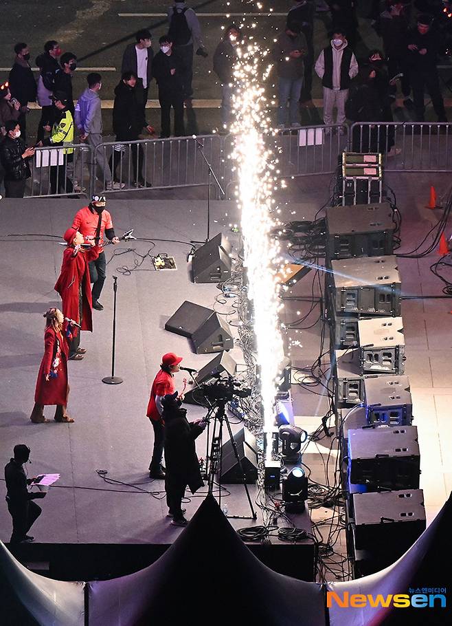 이날 밴드그룹 트랜스픽션이 사전 거리응원에서 축하공연을 펼치고 있다.