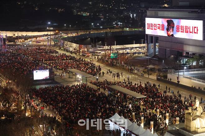 [이데일리 이영훈 기자] 2022 카타르 월드컵 한국과 우루과이의 경기가 열리는 24일 오후 서울 종로구 광화문 광장에서 시민들이 응원을 펼치고 있다.