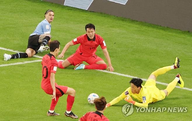 (알라이얀=연합뉴스) 김주성 기자 = 24일 오후(현지시간) 카타르 알라이얀의 에듀케이션 시티 스타디움에서 열린 2022 카타르 월드컵 조별리그 H조 1차전 대한민국과 우루과이 경기. 대한민국 골키퍼 김승규가 우루과이의 역습을 막아내고 있다. 2022.11.24