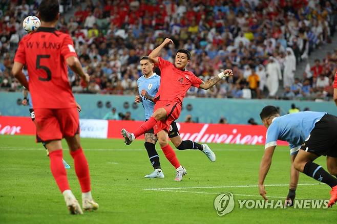 (알라이얀=연합뉴스) 김도훈 기자 = 24일 오후(현지시간) 카타르 알라이얀의 에듀케이션 시티 스타디움에서 열린 2022 카타르 월드컵 조별리그 H조 1차전 대한민국과 우루과이 경기. 한국 김민재가 공을 걷어내고 있다. 2022.11.24