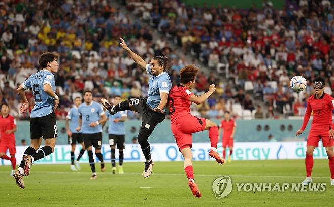 (알라이얀=연합뉴스) 임헌정 기자 = 24일 오후(현지시간) 카타르 알라이얀의 에듀케이션 시티 스타디움에서 열린 2022 카타르 월드컵 조별리그 H조 1차전 대한민국과 우루과이 경기. 후반전 한국 김진수가 우루과이 마르틴 카세레스와 볼경합을 벌이고 있다. 2022.11.24