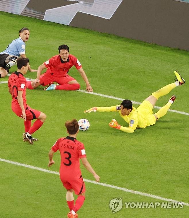 (알라이얀=연합뉴스) 김주성 기자 = 24일 오후(현지시간) 카타르 알라이얀의 에듀케이션 시티 스타디움에서 열린 2022 카타르 월드컵 조별리그 H조 1차전 대한민국과 우루과이 경기. 대한민국 골키퍼 김승규가 우루과이의 역습을 막아내고 있다. 2022.11.24