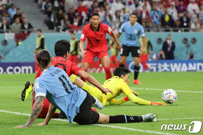 (도하(카타르)=뉴스1) 이동해 기자 = 24일 오후(현지시간) 카타르 알라이얀 에듀케이션 시티 스타디움에서 열린 2022 카타르 월드컵 조별리그 H조 1차전 대한민국과 우루과이의 경기에서 김승규가 누녜스의 크로스를 막아내고 있다. 2022.11.24/뉴스1