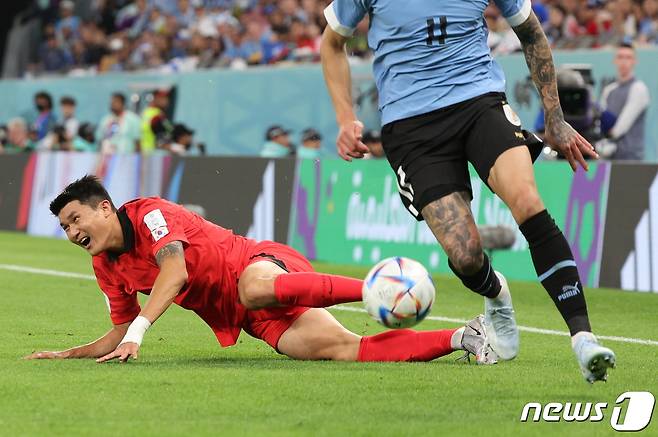 (도하(카타르)=뉴스1) 이동해 기자 = 김민재가 24일 오후(현지시간) 카타르 알라이얀 에듀케이션 시티 스타디움에서 열린 2022 카타르 월드컵 조별리그 H조 1차전 대한민국과 우루과이의 경기에서 미끄러지며 넘어지고 있다. 2022.11.24/뉴스1