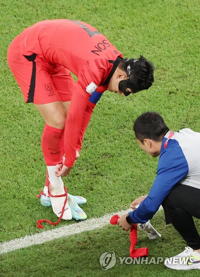 (알라이얀=연합뉴스) 김도훈 기자 = 24일 오후(현지시간) 카타르 알라이얀의 에듀케이션 시티 스타디움에서 열린 2022 카타르 월드컵 조별리그 H조 1차전 대한민국과 우루과이 경기. 대한민국의 손흥민이 우루과이의 카세레스의 거친 태클에 넘어진 뒤 오른쪽 양말이 찢겨져 있다. 2022.11.24