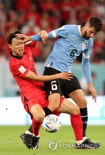 epa10325118 Rodrigo Bentancur (R) of Uruguay in action against Jaesung Lee of South Korea during the FIFA World Cup 2022 group H soccer match between Uruguay and South Korea at Education City Stadium in Doha, Qatar, 24 November 2022. EPA/Tolga Bozoglu