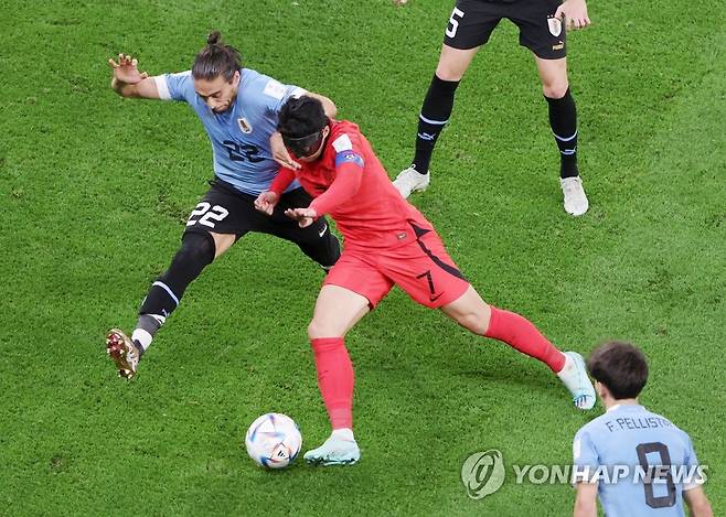 (알라이얀=연합뉴스) 김주성 기자 = 24일 오후(현지시간) 카타르 알라이얀의 에듀케이션 시티 스타디움에서 열린 2022 카타르 월드컵 조별리그 H조 1차전 대한민국과 우루과이 경기. 대한민국 주장 손흥민이 우루과이 수비수와 볼 경합을 벌이며 볼 소유권을 유지하고 있다. 2022.11.24