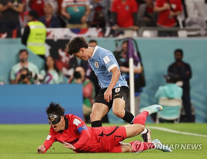 (알라이얀=연합뉴스) 임헌정 기자 = 24일 오후(현지시간) 카타르 알라이얀의 에듀케이션 시티 스타디움에서 열린 2022 카타르 월드컵 조별리그 H조 1차전 대한민국과 우루과이 경기. 한국 손흥민이 우루과이 수비수 카세레스의 거친 태클에 넘어지고 있다. 2022.11.24