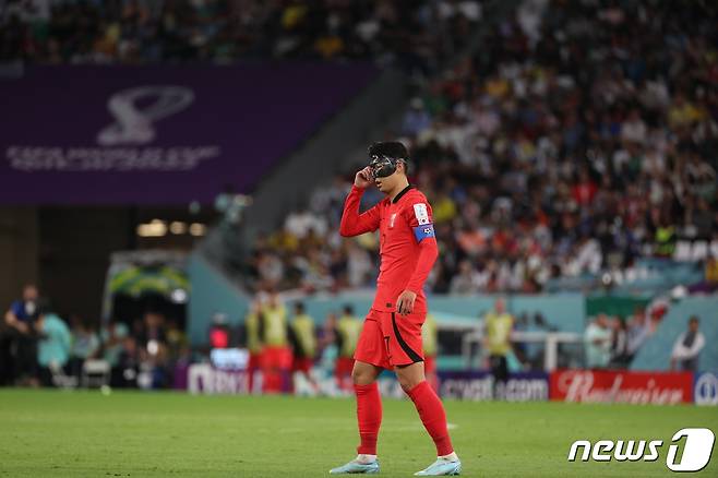 (도하(카타르)=뉴스1) 이광호 기자 = 손흥민이 24일 오후(현지시간) 카타르 알라이얀 에듀케이션 시티 스타디움에서 열린 2022 카타르 월드컵 조별리그 H조 1차전 대한민국과 우루과이의 경기에서 안면 마스크를 조정하고 있다. 2022.11.24/뉴스1