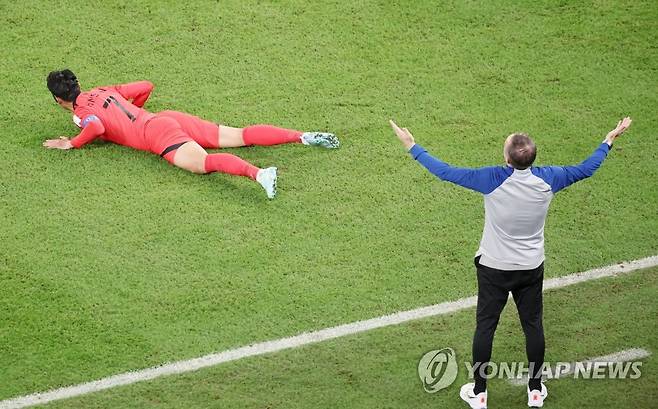(알라이얀=연합뉴스) 김주성 기자 = 24일 오후(현지시간) 카타르 알라이얀의 에듀케이션 시티 스타디움에서 열린 2022 카타르 월드컵 조별리그 H조 1차전 대한민국과 우루과이 경기. 대한민국 주장 손흥민이 우루과이 수비수와 볼 경합을 벌이던 중 넘어지자 벤투 감독이 심판에게 항의하고 있다. 2022.11.24