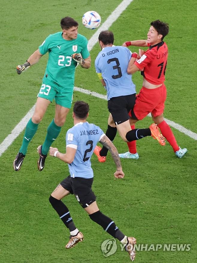 (알라이얀=연합뉴스) 김주성 기자 = 24일 오후(현지시간) 카타르 알라이얀의 에듀케이션 시티 스타디움에서 열린 2022 카타르 월드컵 조별리그 H조 1차전 대한민국과 우루과이 경기. 대한민국 황의조가 우루과이 공격을 펼치던 중 우루과이 디에고 고딘에 막힌 뒤 상대 골키퍼가 공을 따내고 있다. 2022.11.24