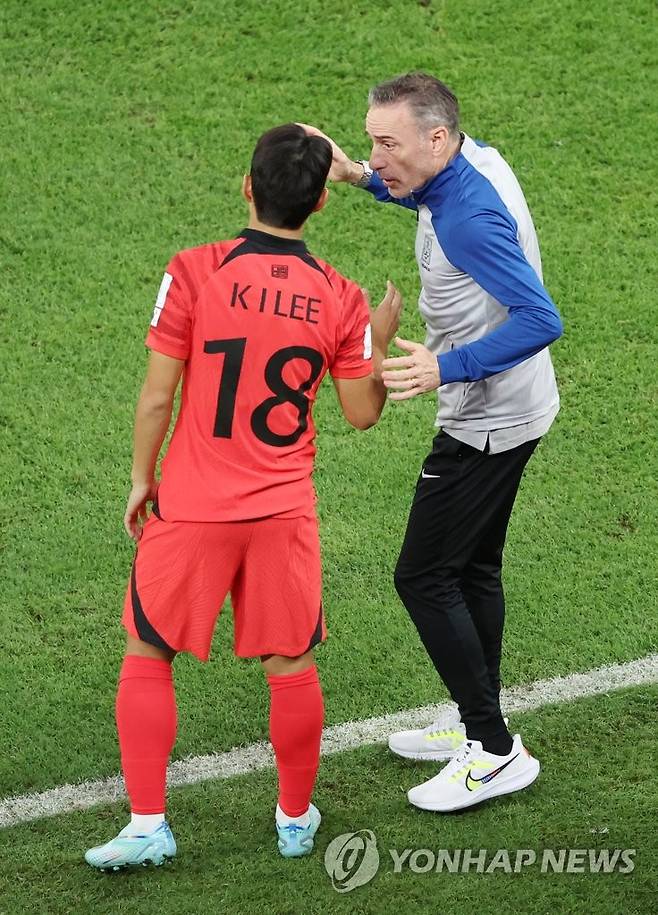 (알라이얀=연합뉴스) 김주성 기자 = 24일 오후(현지시간) 카타르 알라이얀의 에듀케이션 시티 스타디움에서 열린 2022 카타르 월드컵 조별리그 H조 1차전 대한민국과 우루과이 경기. 대한민국 파울루 벤투 감독이 후반 교체 멤버로 이강인을 투입하며 작전 지시를 하고 있다. 2022.11.24