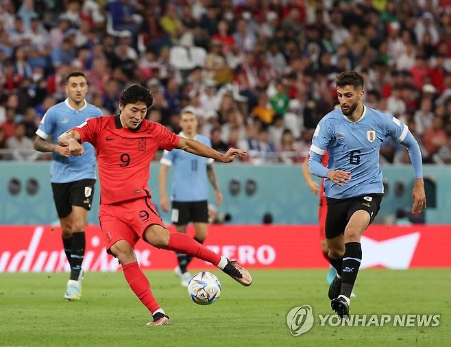 (알라이얀=연합뉴스) 임헌정 기자 = 24일 오후(현지시간) 카타르 알라이얀의 에듀케이션 시티 스타디움에서 열린 2022 카타르 월드컵 조별리그 H조 1차전 대한민국과 우루과이 경기. 후반전 교체 투입된 한국 조규성이 슈팅을 시도하고 있다. 2022.11.24