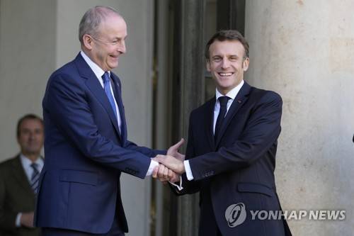 French President Emmanuel Macron, right, greets Ireland's Prime Minister Micheal Martin prior to their meeting at the Elysee Palace, in Paris, Thursday, Nov. 24, 2022. (AP Photo/Thibault Camus)