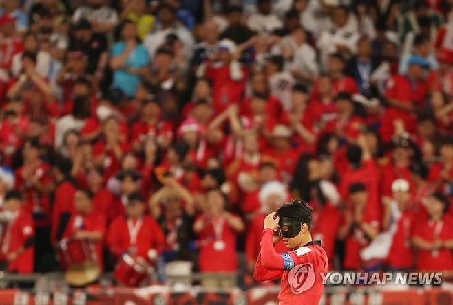 (알라이얀=연합뉴스) 임헌정 기자 = 24일 오후(현지시간) 카타르 알라이얀의 에듀케이션 시티 스타디움에서 열린 2022 카타르 월드컵 조별리그 H조 1차전 대한민국과 우루과이 경기. 후반전 한국 손흥민이 안면 마스크를 만지고 있다. 2022.11.24