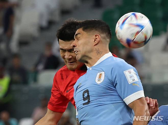 [알라이얀(카타르)=뉴시스] 조성우 기자 = 24일(현지시간) 카타르 알라이얀 에듀케이션 시티 스타디움에서 열린 2022 카타르 월드컵 H조 1차전 대한민국과 우루과이의 경기, 김민재와 수아레즈가 헤딩 경합을 하고있다. 2022.11.24. xconfind@newsis.com
