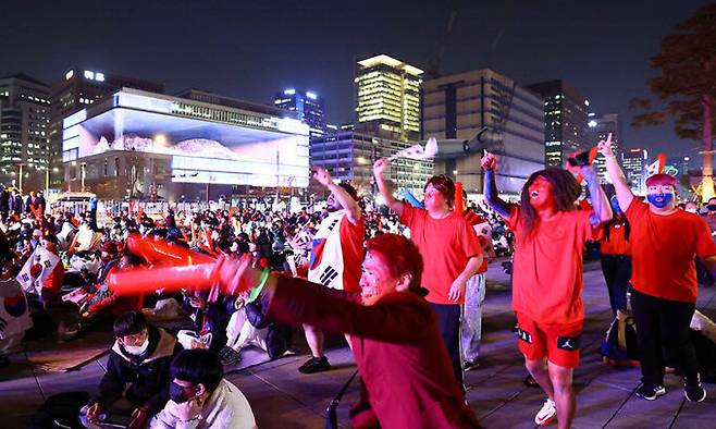 우루과이전이 열린 24일 시민들이 서울 광화문광장에서 대한민국 축구팀을 응원하고 있다. 일부 시민들은 한국 응원단인 ‘붉은 악마’를 상징하는 붉은색 옷을 입고 나와 응원 분위기를 돋웠다.