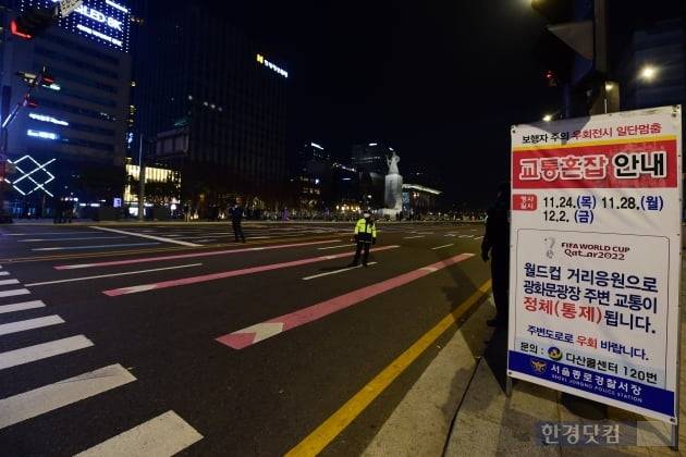 '2022 카타르 월드컵' H조 대한민국 대 우르과이의 경기가 펼쳐지는 24일 오후 서울 광화문광장 특설무대에 많은 시민들이 몰리자 도로를 통제하고 있다.