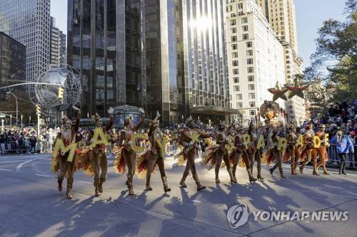 Performers walk through Columbus Circle during the Macy's Thanksgiving Day Parade, Thursday, Nov. 24, 2022, in New York. (AP Photo/Jeenah Moon)