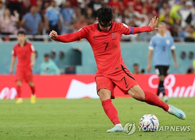 (알라이얀=연합뉴스) 임헌정 기자 = 24일 오후(현지시간) 카타르 알라이얀의 에듀케이션 시티 스타디움에서 열린 2022 카타르 월드컵 조별리그 H조 1차전 대한민국과 우루과이 경기. 후반전 한국 손흥민이 슈팅을 시도하고 있다. 2022.11.24