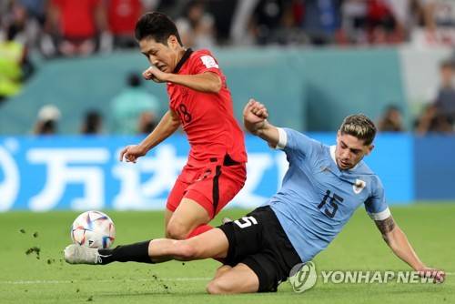 epa10325199 Federico Valverde (R) of Uruguay in action against Kangin Lee of South Korea during the FIFA World Cup 2022 group H soccer match between Uruguay and South Korea at Education City Stadium in Doha, Qatar, 24 November 2022. EPA/Tolga Bozoglu