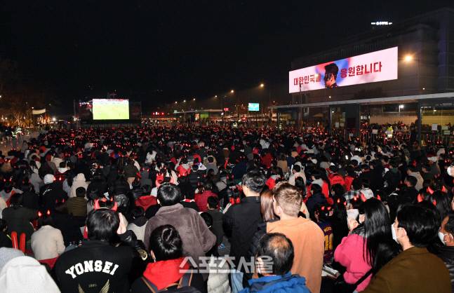 24일 한국과 우루과이의 카타르 월드컵 H조 조별리그 1차전이 열리는 가운데 축구팬들이 광화문광장에서 응원을 펼치고 있다. 2022. 11. 24.