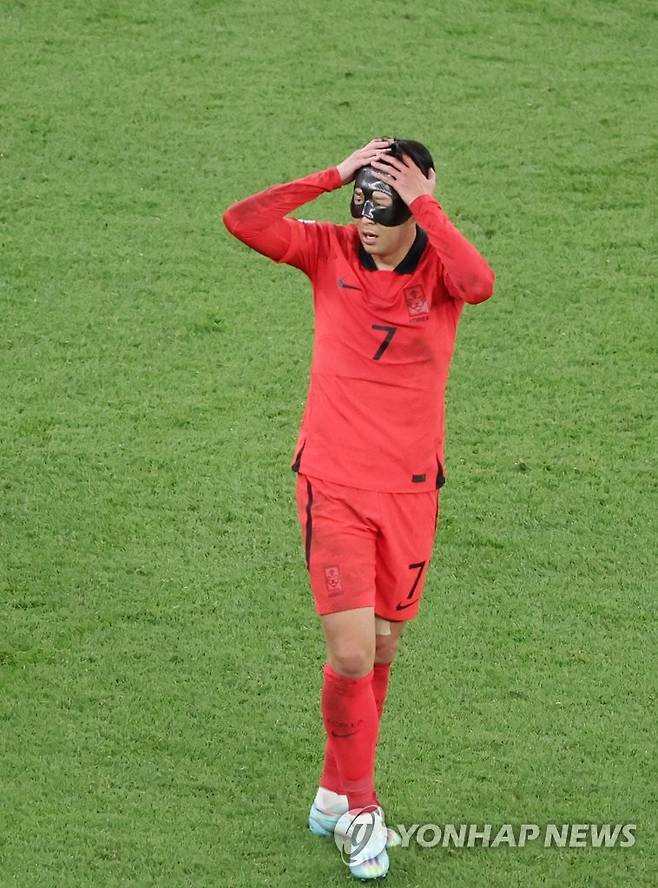 (알라이얀=연합뉴스) 김주성 기자 = 24일 오후(현지시간) 카타르 알라이얀의 에듀케이션 시티 스타디움에서 열린 2022 카타르 월드컵 조별리그 H조 1차전 대한민국과 우루과이 경기. 대한민국 손흥민이 후반 공격이 잘 풀리지 않자 아쉬운 표정을 짓고 있다. 2022.11.24