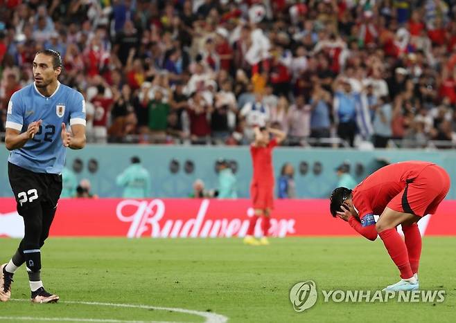 (알라이얀=연합뉴스) 임헌정 기자 = 24일 오후(현지시간) 카타르 알라이얀의 에듀케이션 시티 스타디움에서 열린 2022 카타르 월드컵 조별리그 H조 1차전 대한민국과 우루과이 경기. 후반전 한국 손흥민이 슈팅이 빗나가자 아쉬워하고 있다. 2022.11.24