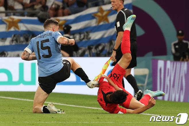 (도하(카타르)=뉴스1) 이동해 기자 = 24일 오후(현지시간) 카타르 알라이얀 에듀케이션 시티 스타디움에서 열린 2022 카타르 월드컵 조별리그 H조 1차전 대한민국과 우루과이의 경기에서 이강인이 발베르데의 반칙성 태클에 널어지고 있다. 2022.11.24/뉴스1