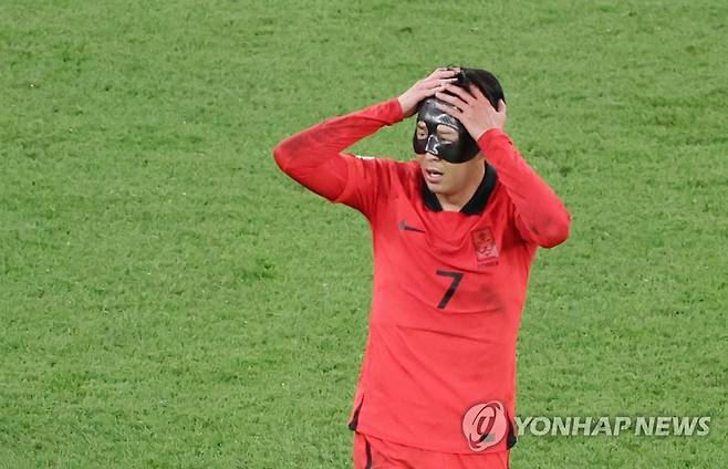 (알라이얀=연합뉴스) 김주성 기자 = 24일 오후(현지시간) 카타르 알라이얀의 에듀케이션 시티 스타디움에서 열린 2022 카타르 월드컵 조별리그 H조 1차전 대한민국과 우루과이 경기. 대한민국 손흥민이 후반 공격이 잘 풀리지 않자 아쉬운 표정을 짓고 있다. 2022.11.24