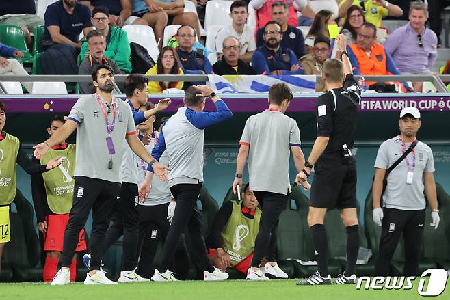 (도하(카타르)=뉴스1) 이동해 기자 = 24일 오후(현지시간) 카타르 알라이얀 에듀케이션 시티 스타디움에서 열린 2022 카타르 월드컵 조별리그 H조 1차전 대한민국과 우루과이의 경기에서 파울루 벤투 감독이 심판에게 강하게 항의하자 경고를 받고 있다. 2022.11.24/뉴스1